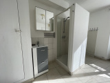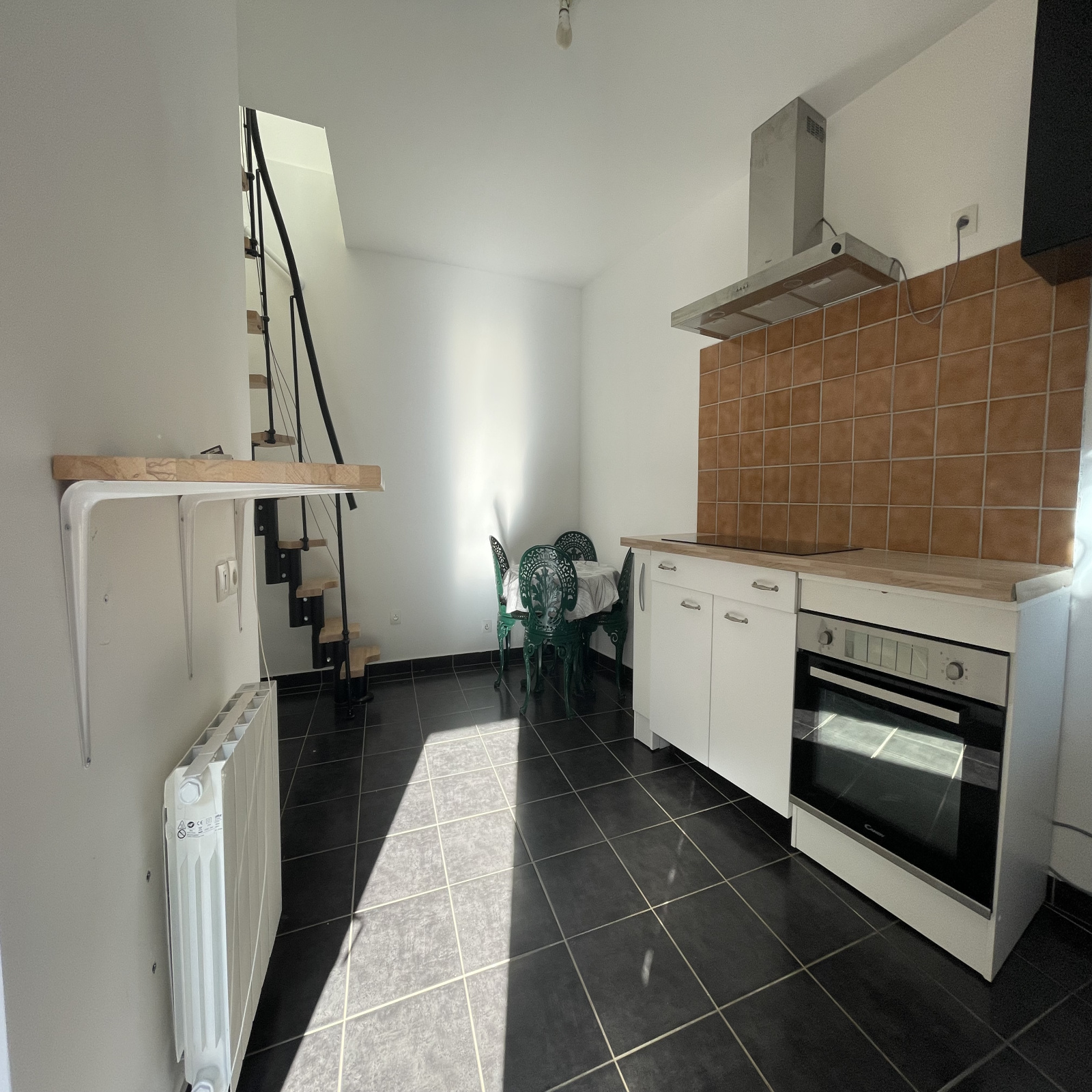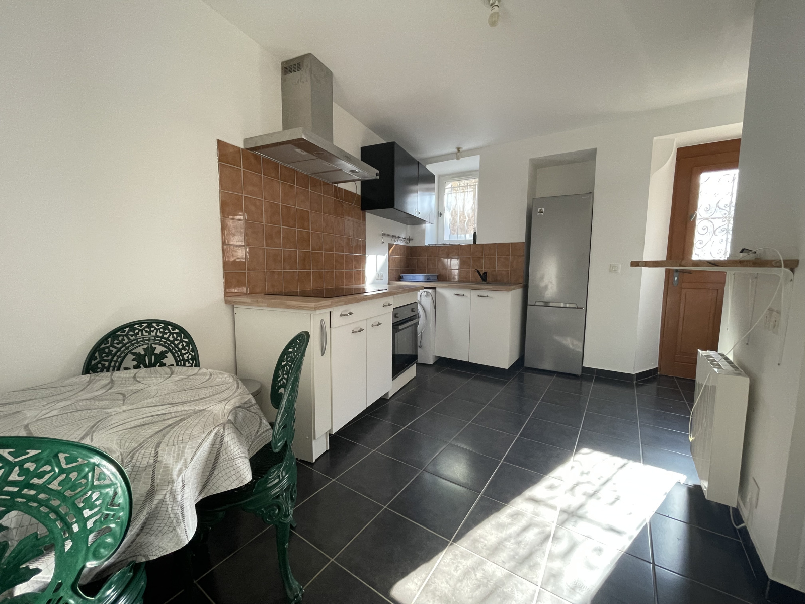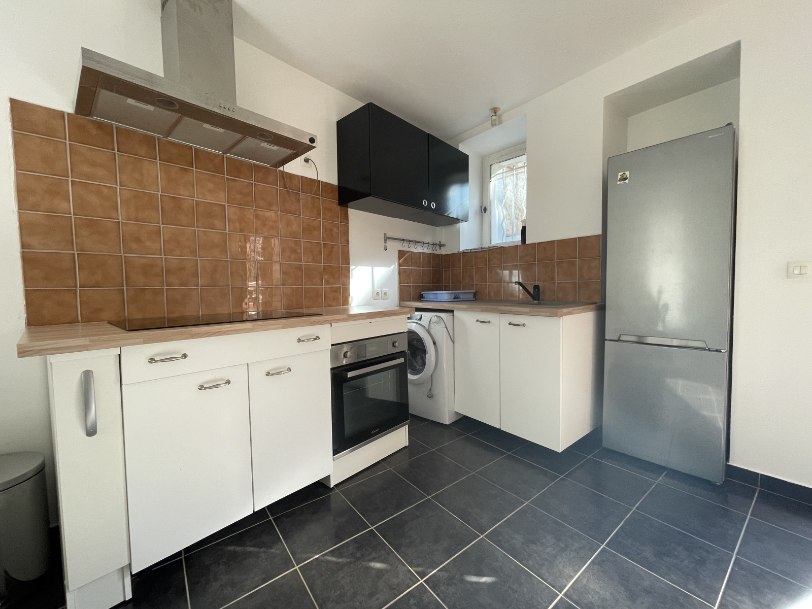 Au rez-de-chaussée, vous trouverez un séjour avec placard et cuisine ouverte, aménagée et entièrement équipée : four, plaque de cuisson, hotte, réfrigérateur et machine à laver et un WC séparé.