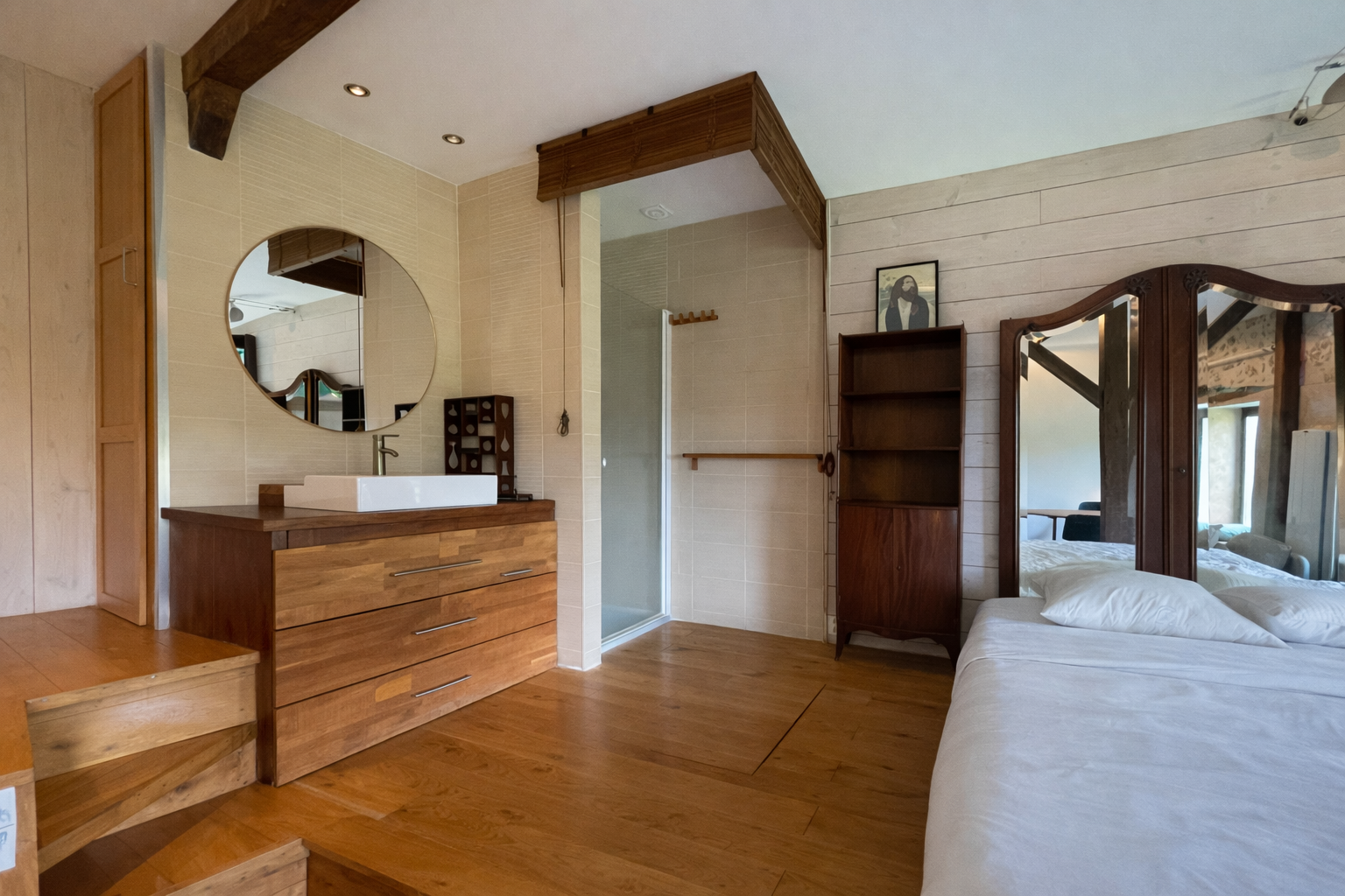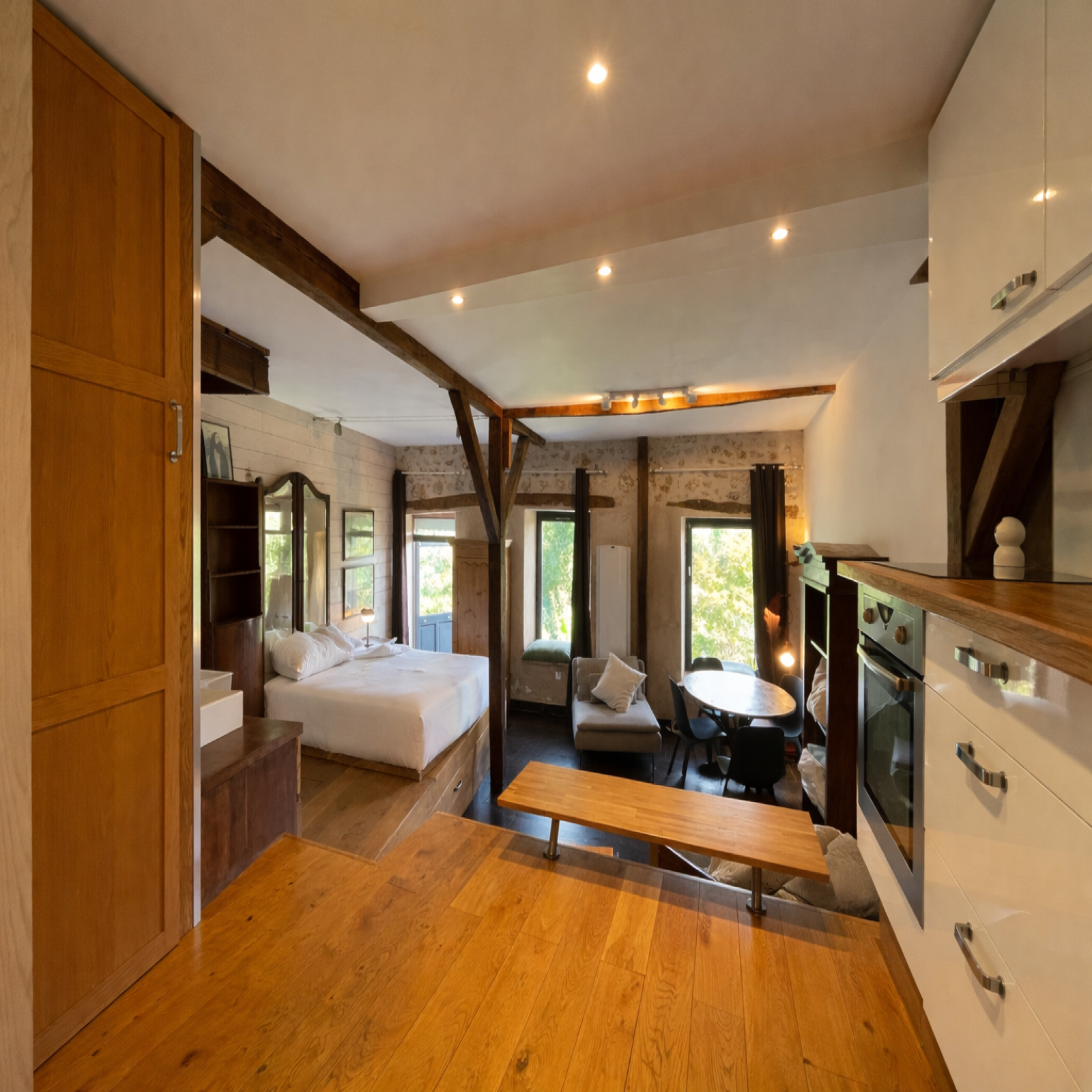 Vous y trouverez une entrée avec WC séparé, menant vers une cuisine aménagée et entièrement équipée, ouverte sur un espace nuit meublé, dotée de sa douche, pour un quotidien tout en confort.