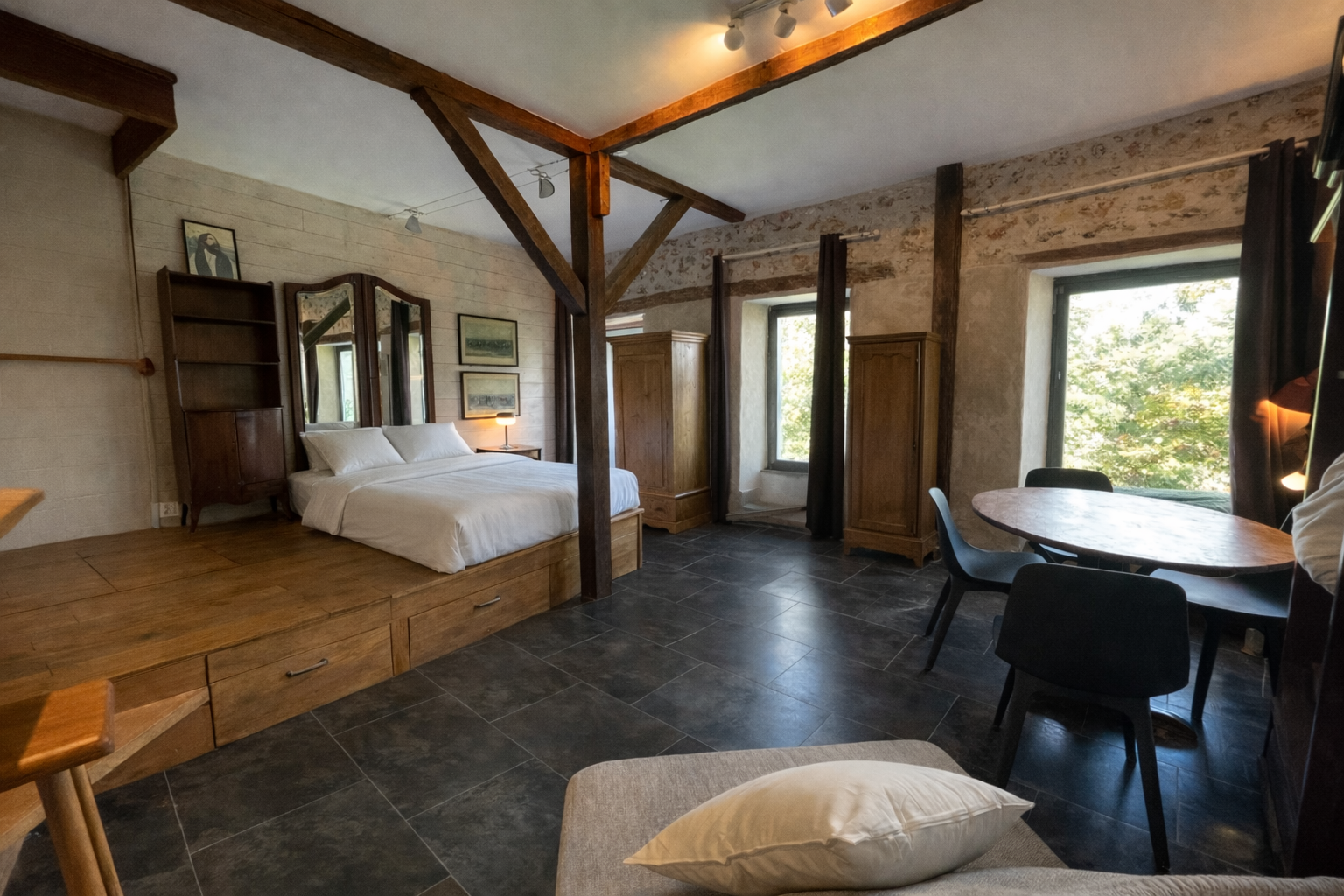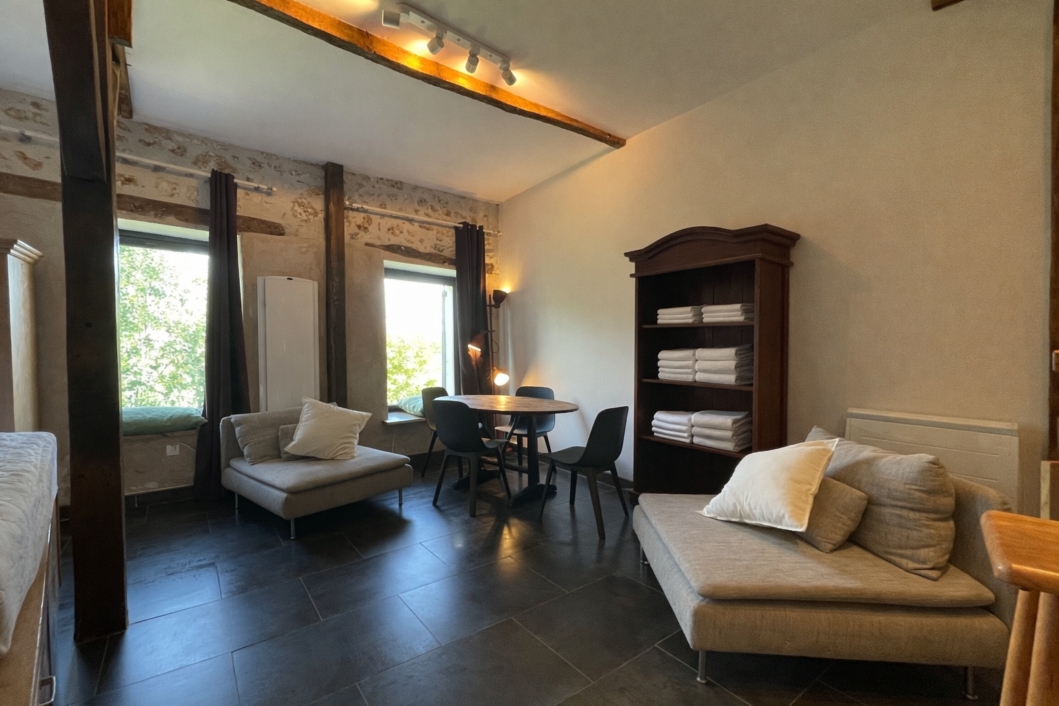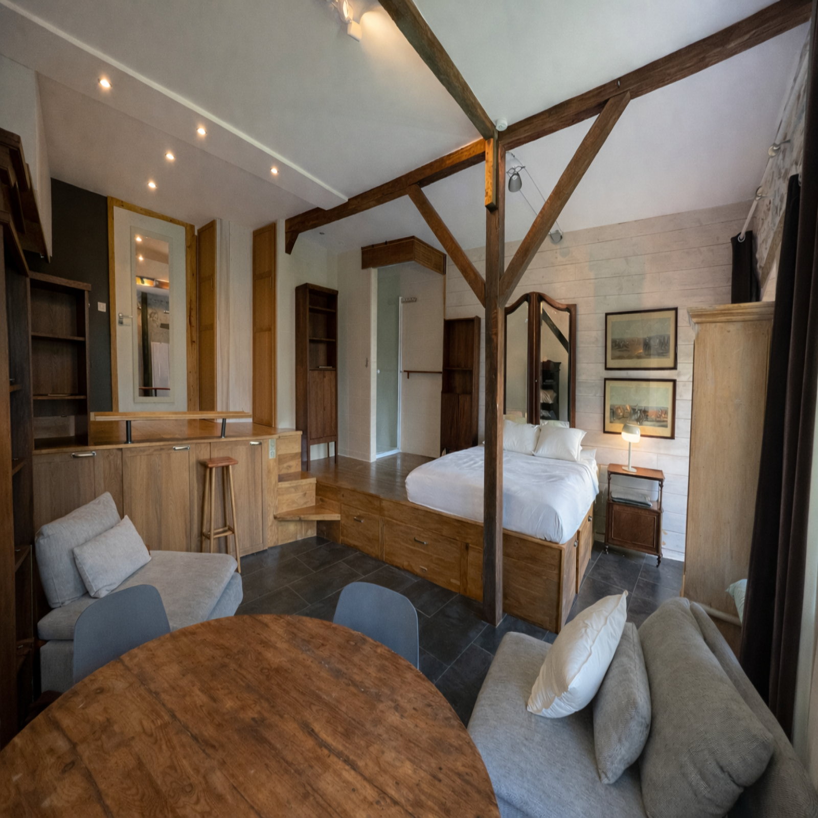 Le logement s’ouvre également sur un séjour meublé, prolongé par une petite cave offrant un espace de rangement appréciable. L’accès à cette cave se fait par une trappe discrète située dans le plancher de la partie nuit, ajoutant une touche originale et pratique à l’aménagement.