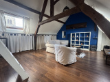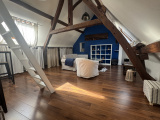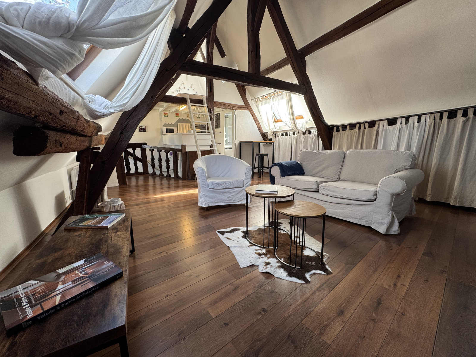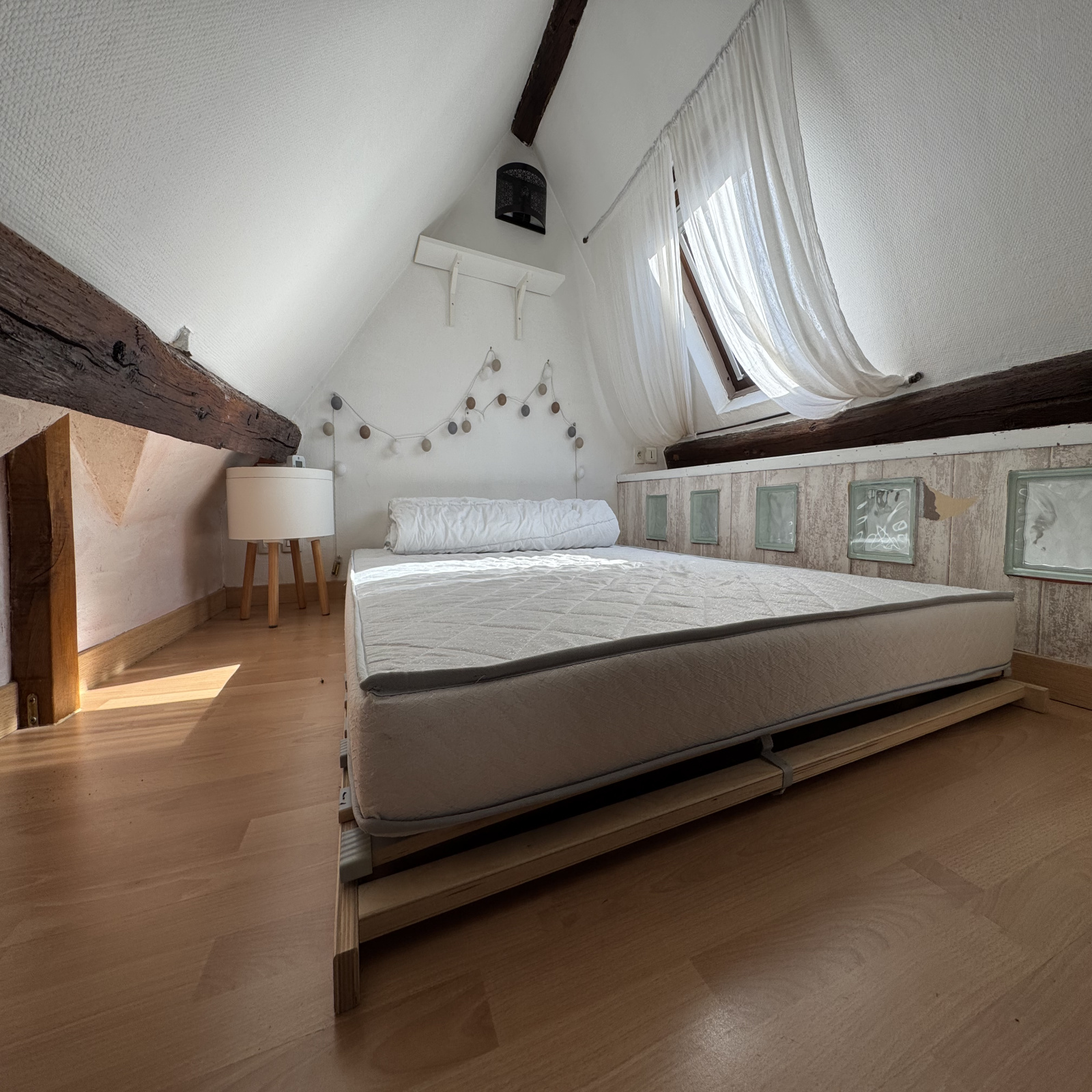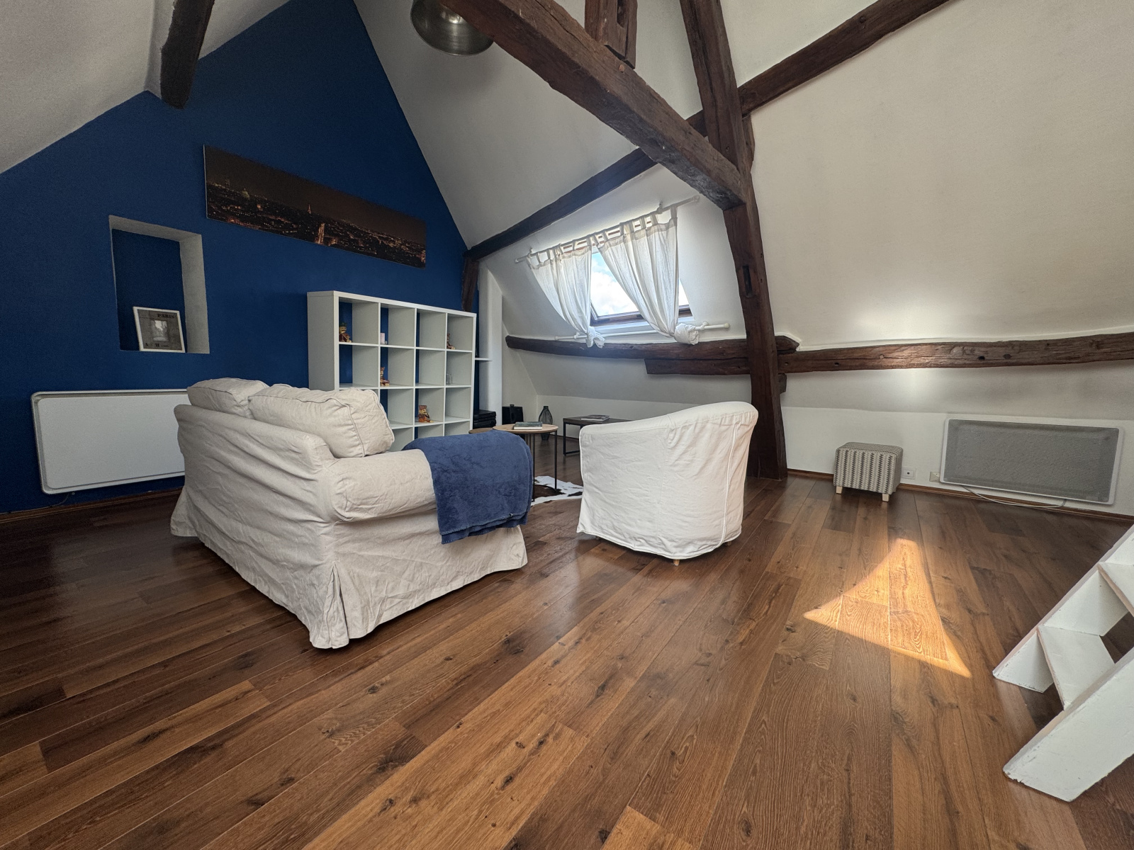 Une spacieuse pièce de vie parquetée, de plus de 32 m² au sol, avec belles hauteurs sous plafond, une cuisine ouverte, une salle de douche avec WC et avec ballon d 'eau chaude tout récent (2024), un coin nuit en mezzanine avec velux a été aménagé, pour plus d'intimité.