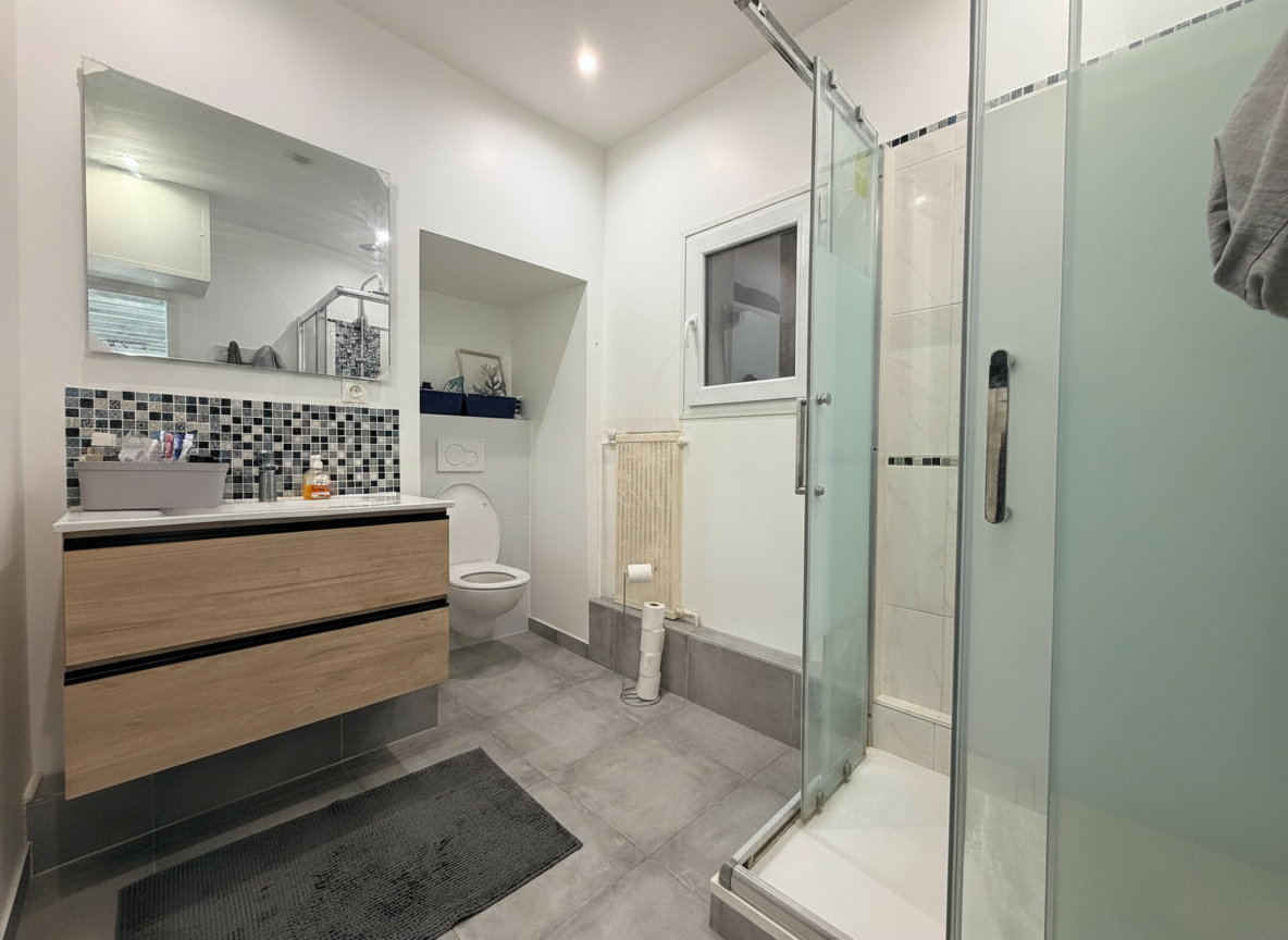 La chambre est spacieuse et la salle de douche récente et fonctionnelle.
