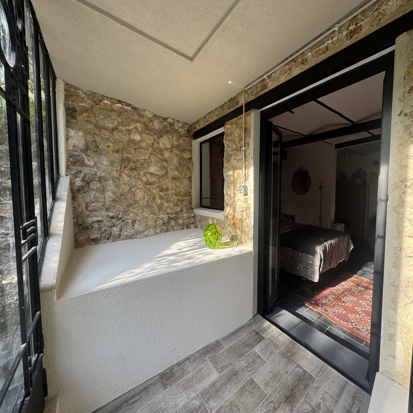 En rez-de-jardin : un espace composé d'une chambre avec dressing et d'une petite véranda.