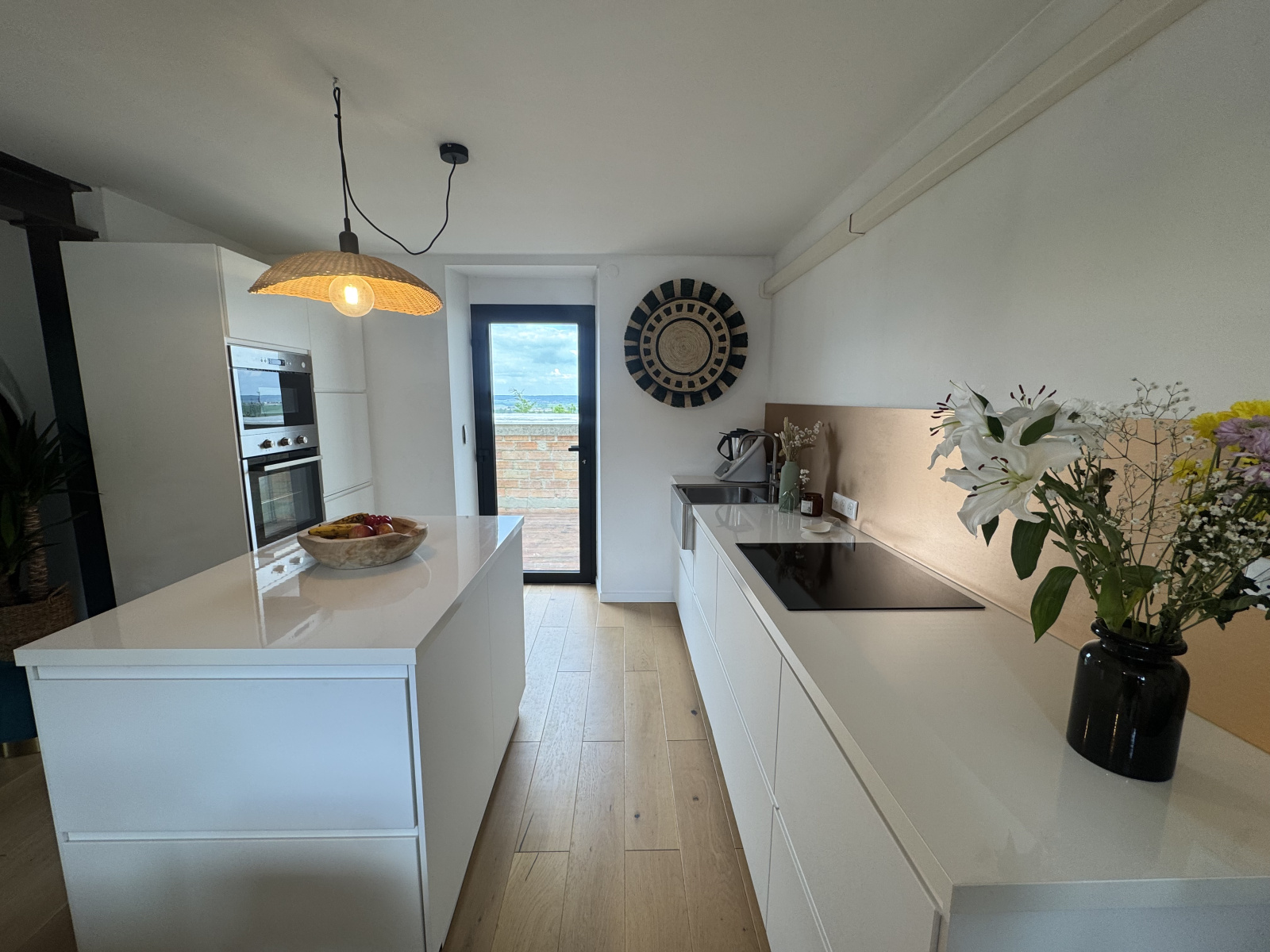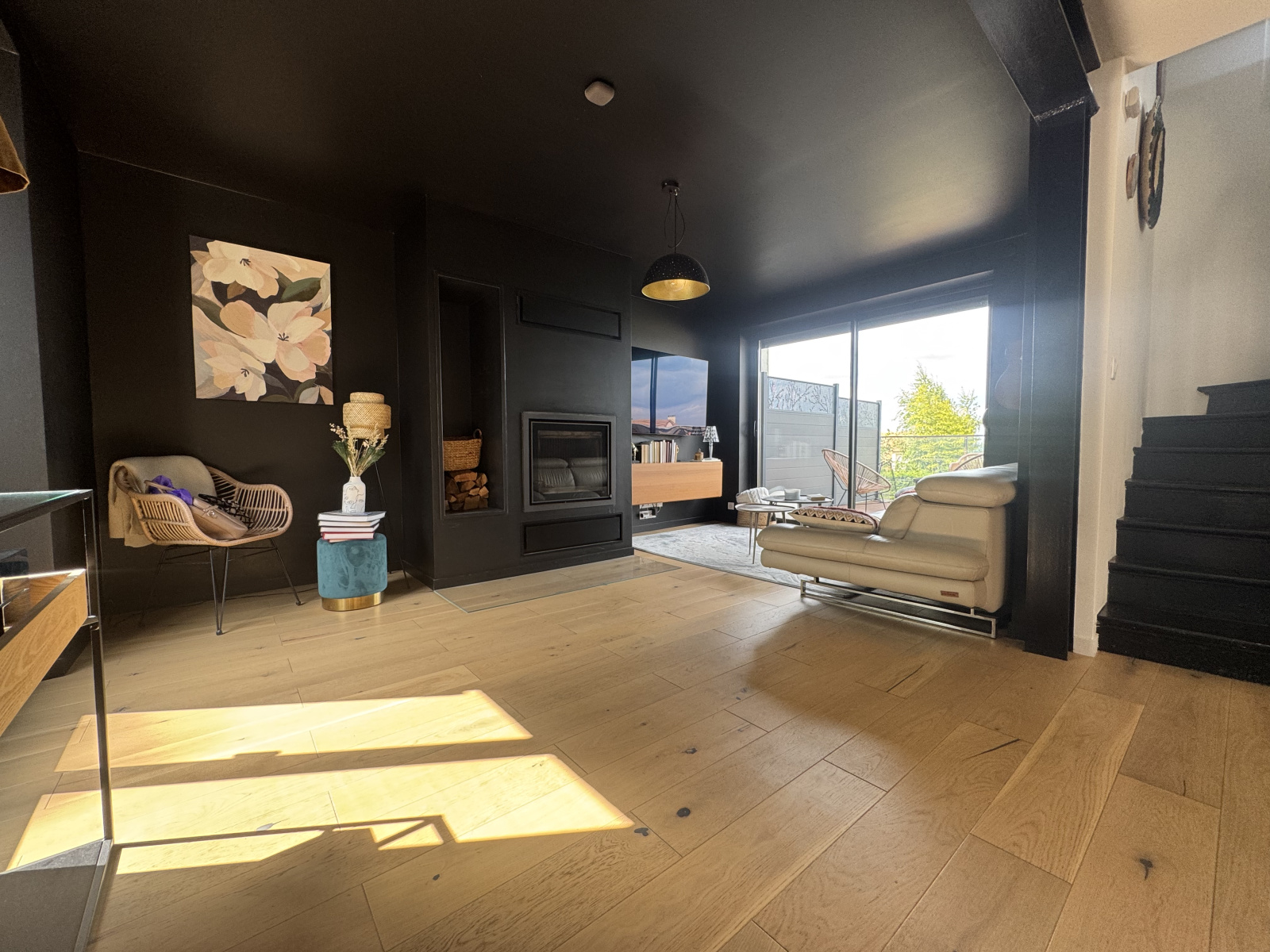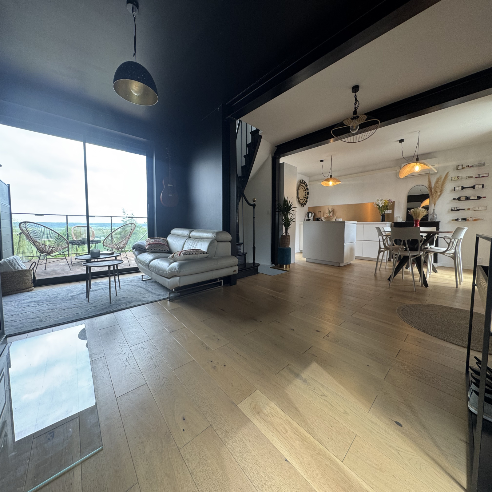Au rez-de-chaussée : une agréable pièce de vie traversante avec cheminée, double exposition, salle à manger et cuisine moderne équipée, le tout agréablement prolongée d'une terrasse de 30 m² avec vue imprenable sur la vallée.