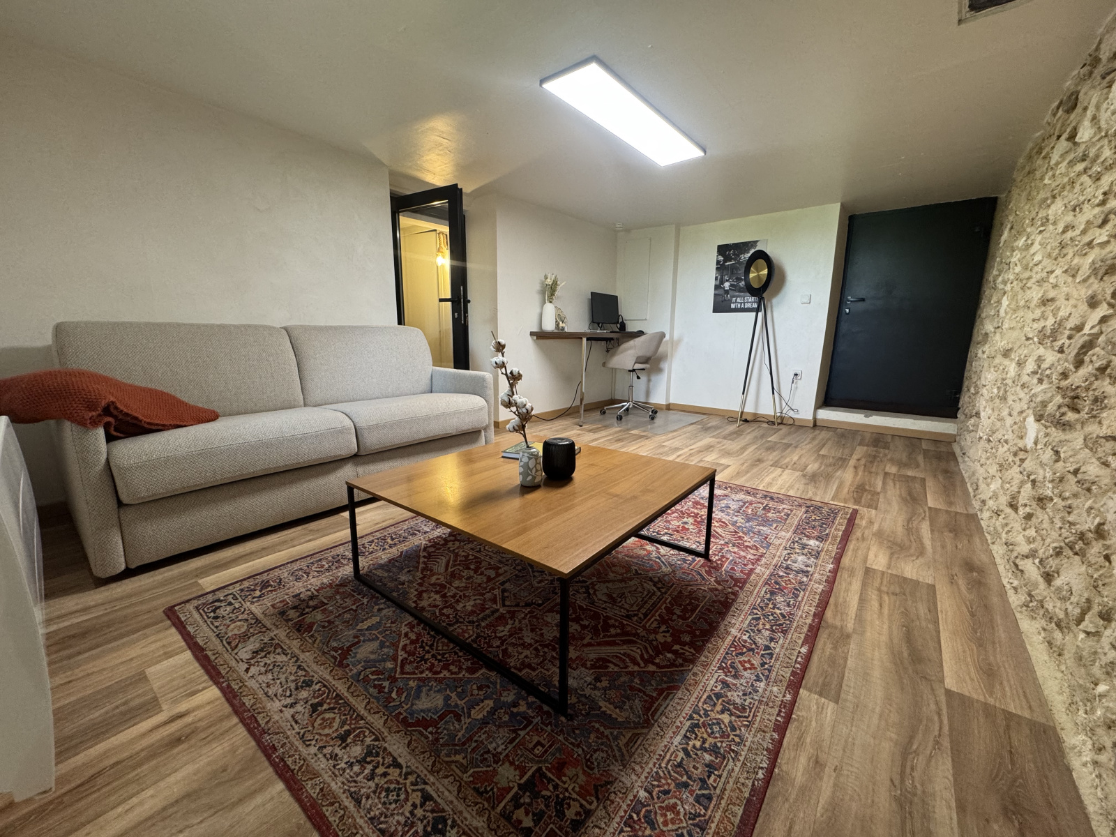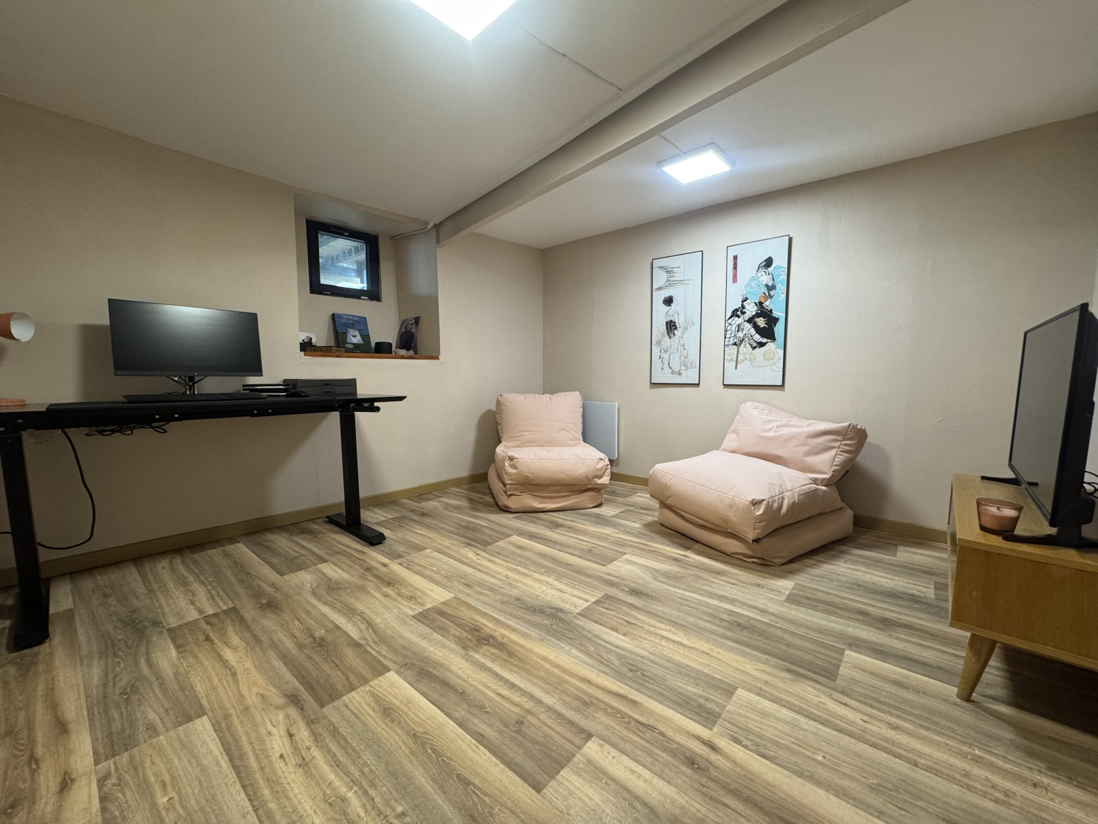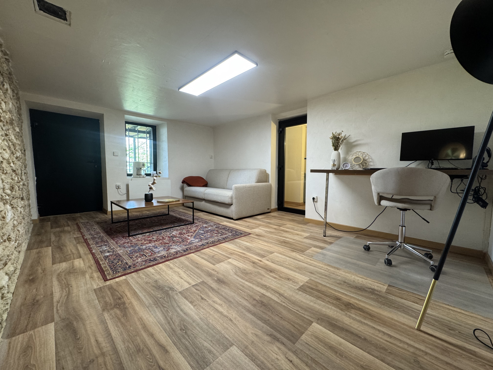 En rez-de-jardin, vous trouverez un grand bureau ou chambre avec mur en pierres, WC, une buanderie et une autre pièce pouvant faire office de bureau ou chambre d'ami.