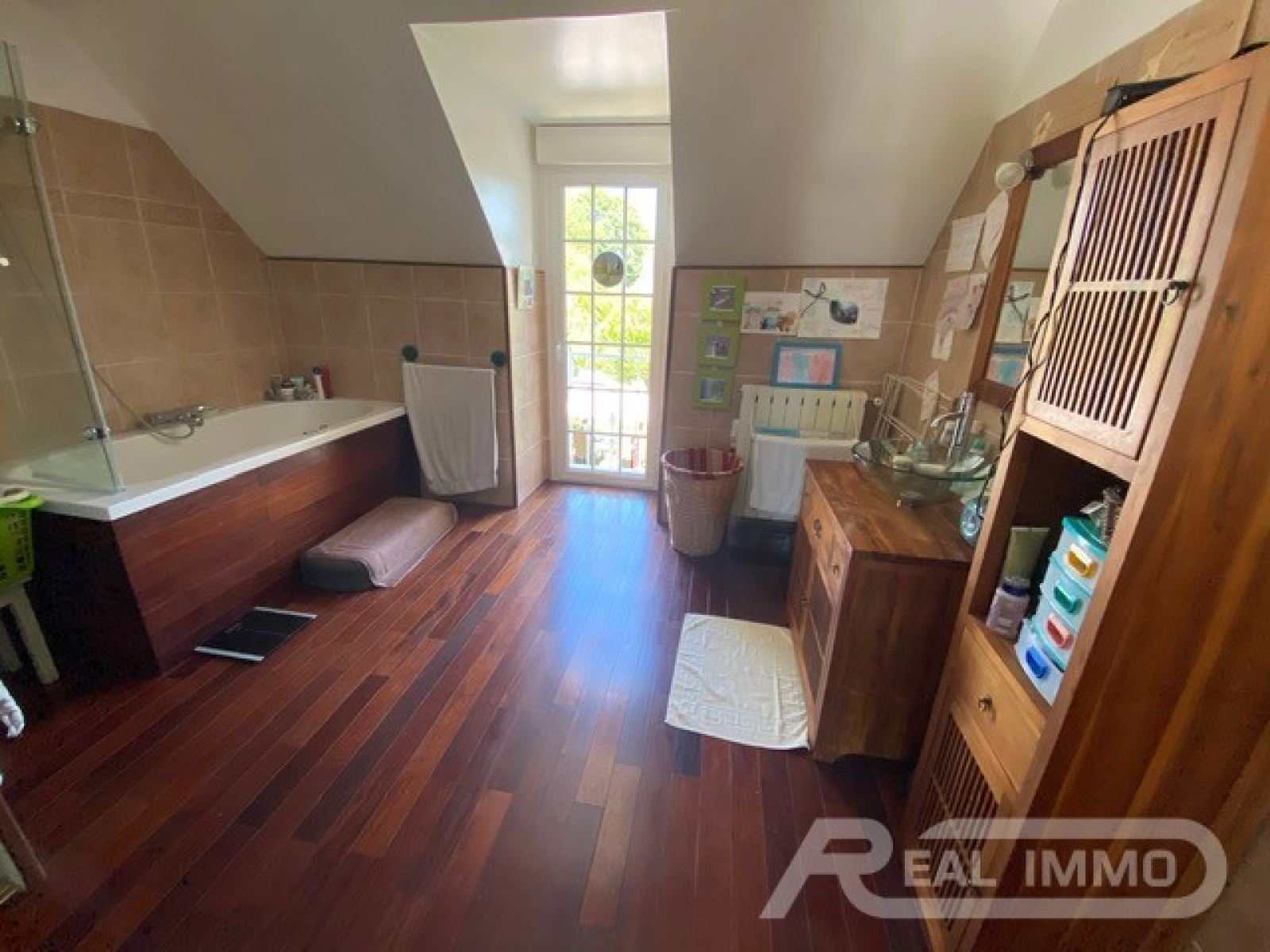 A l'étage un palier dessert une vaste suite parentale parquetée (25 m²) avec salle de bains en teck et baignoire balnéo, 3 belles chambres parquetées avec placards, une salle de douche, WC indépendants.