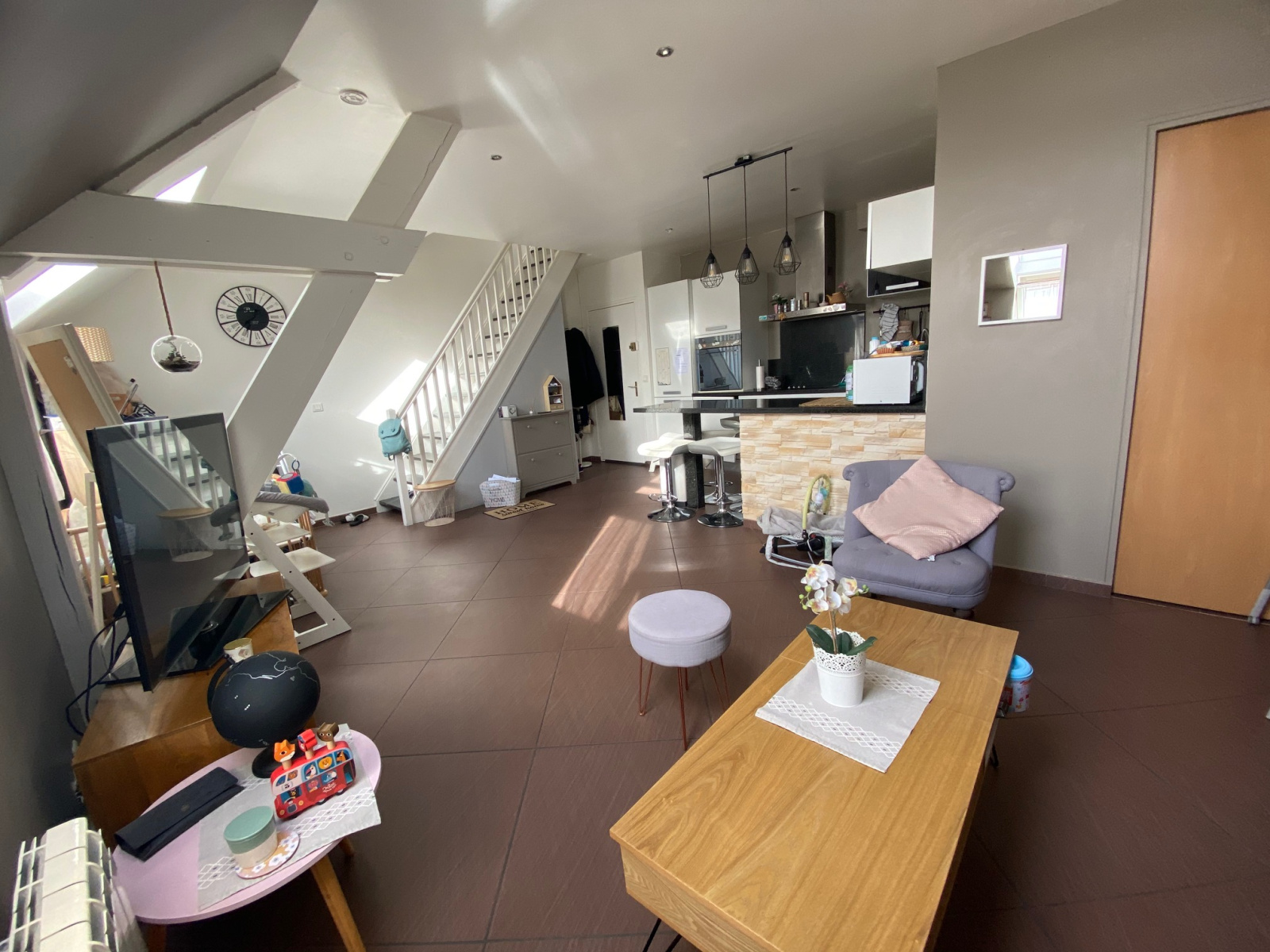 D'UNE ENTREE SUR SEJOUR TRES LUMINEUX DE 33 M2 (EXPO SUD) AVEC CUISINE OUVERTE, UNE SALLE D'EAU AVEC WC ET A L'ETAGE UN PALIER/BUREAU AVEC RANGEMENT DESSERT UNE CHAMBRE.