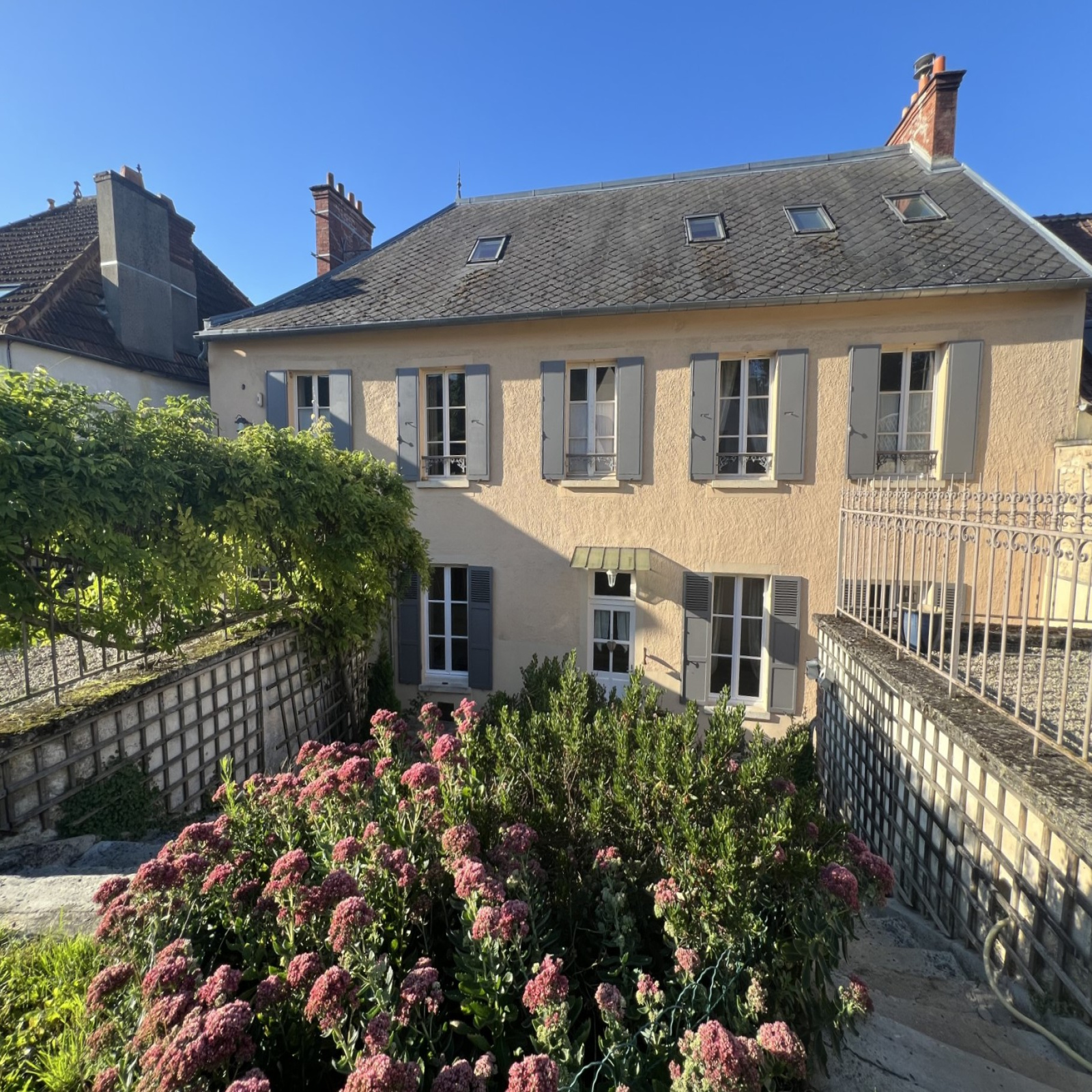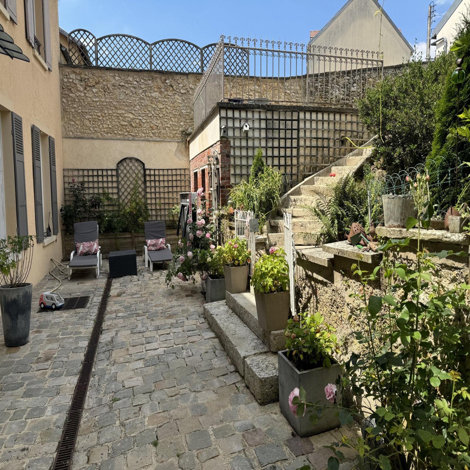 Joli jardin clos de murs en pierres. Tous les commerces à pied.