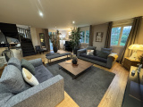 Exposée SUD, elle dispose d'une pièce à vivre de près de 100 m², parquetée, décorée avec goût et agrémentée d'un très beau poêle à bois. De nombreuses ouvertures donnent sur le jardin et la terrasse.