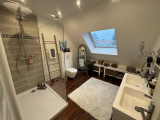 A l'étage : un palier distribue 3 belles chambres, une pièce dressing (possible chambre), et deux salle d'eau impeccables avec parquet pont de bâteau et WC.