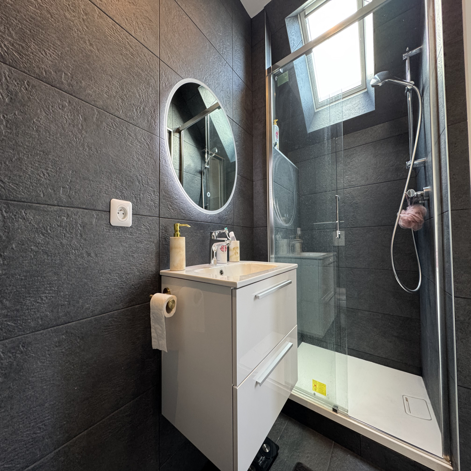 Au RDC : Une entrée avec rangement, WC, un spacieux salon/séjour de plus de 50 m² avec poele à granules, un bureau, une chambre avec salle de bains et WC.