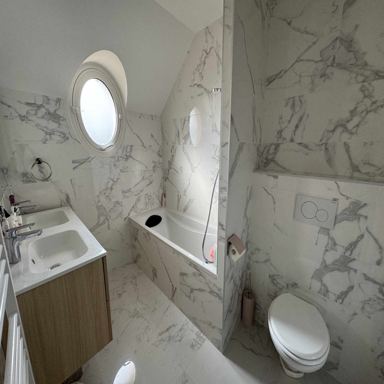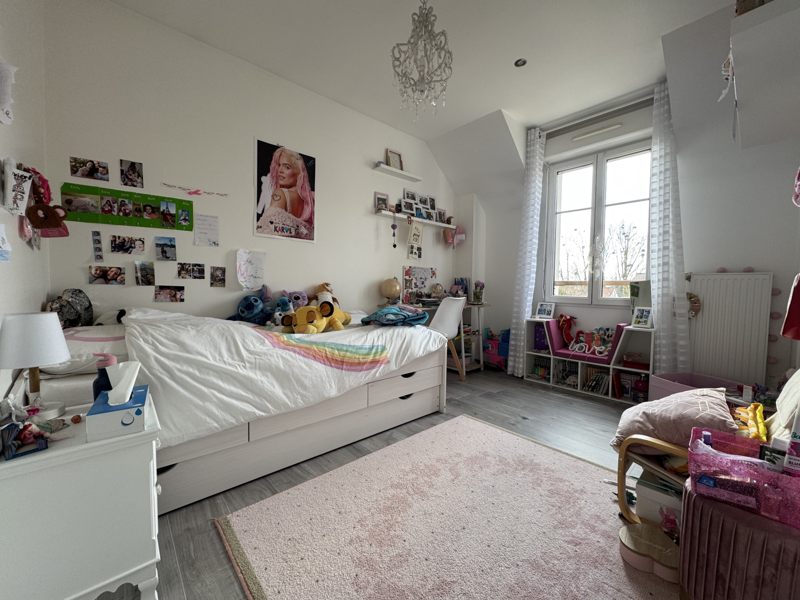 Un garage double carrelé avec grenier complète les prestations.