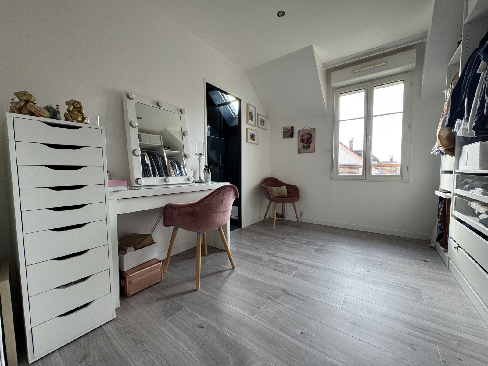 A l'étage : Un palier/ bureau dessert deux chambres, une salle de bains double vasque avec WC et une suite parentale avec grand dressing, salle de douche et WC.