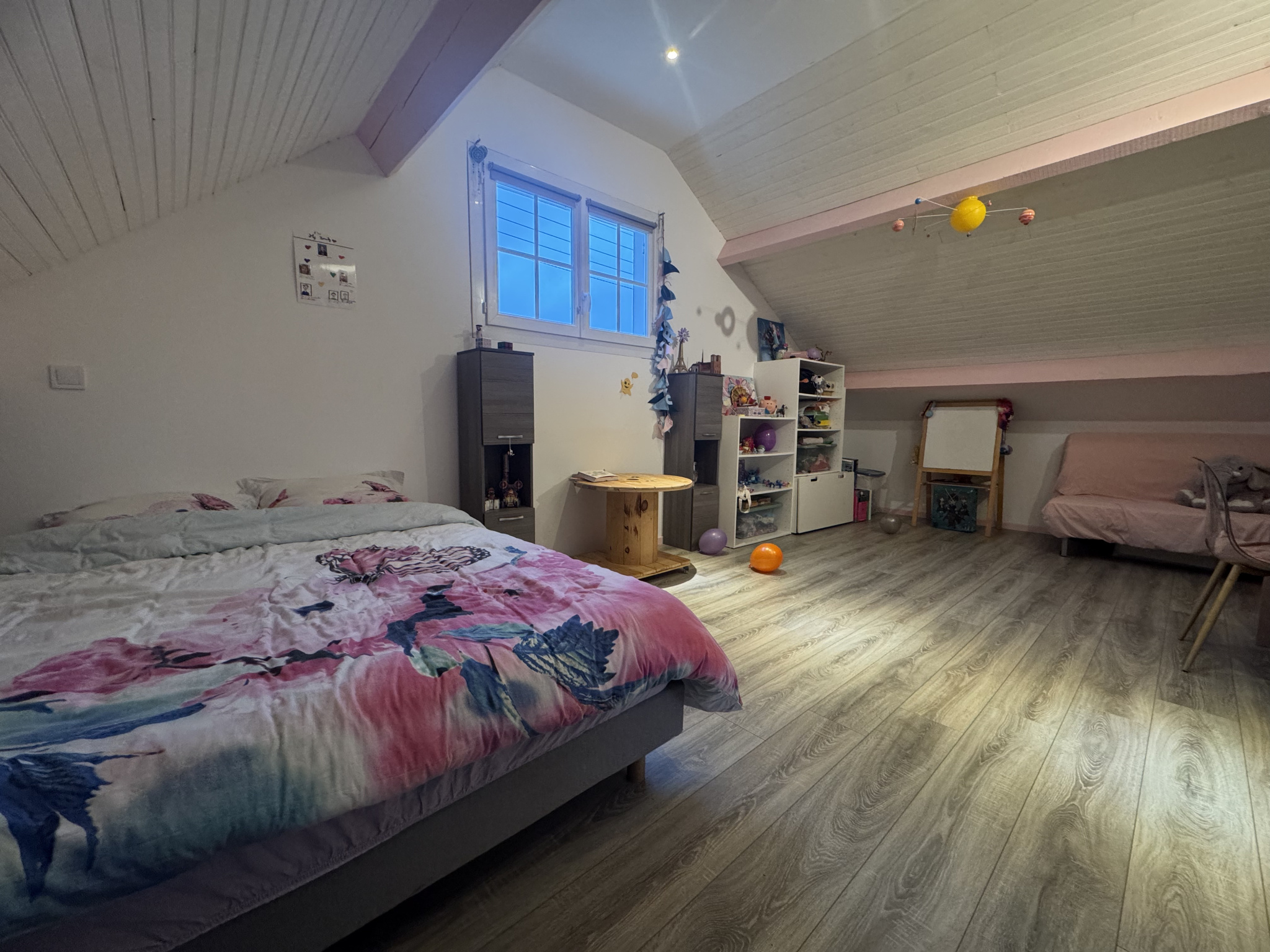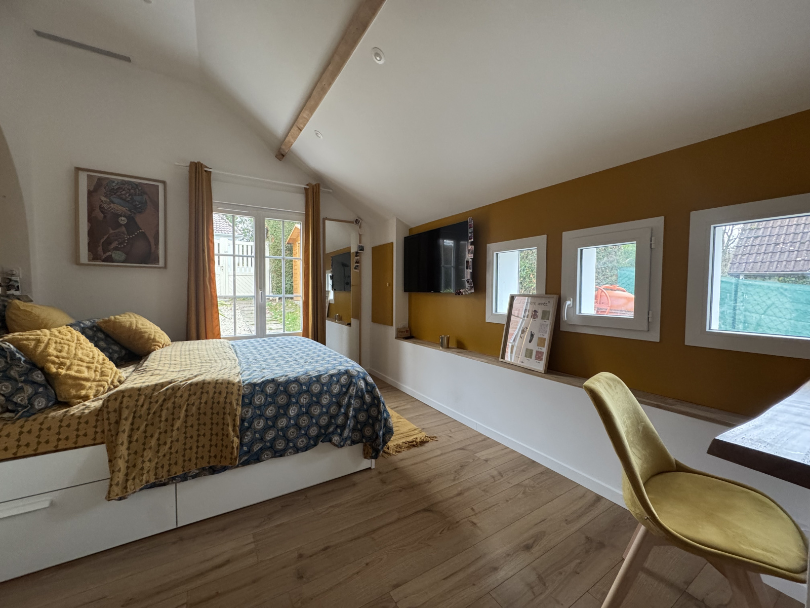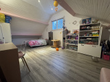 A l'étage : un palier avec rangement dessert une grande chambre (19 m²) et une salle de bains avec WC.