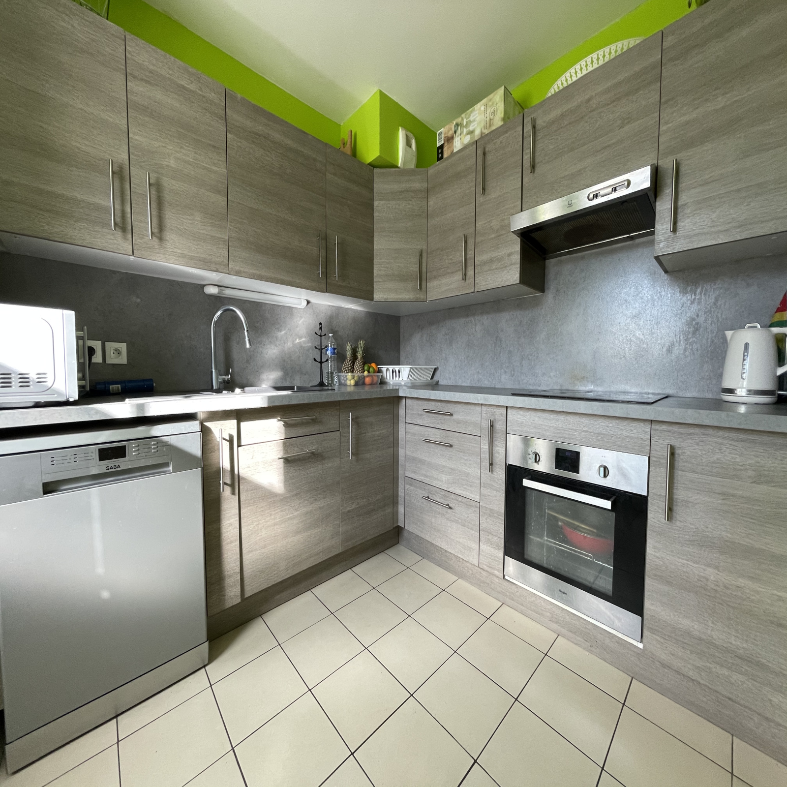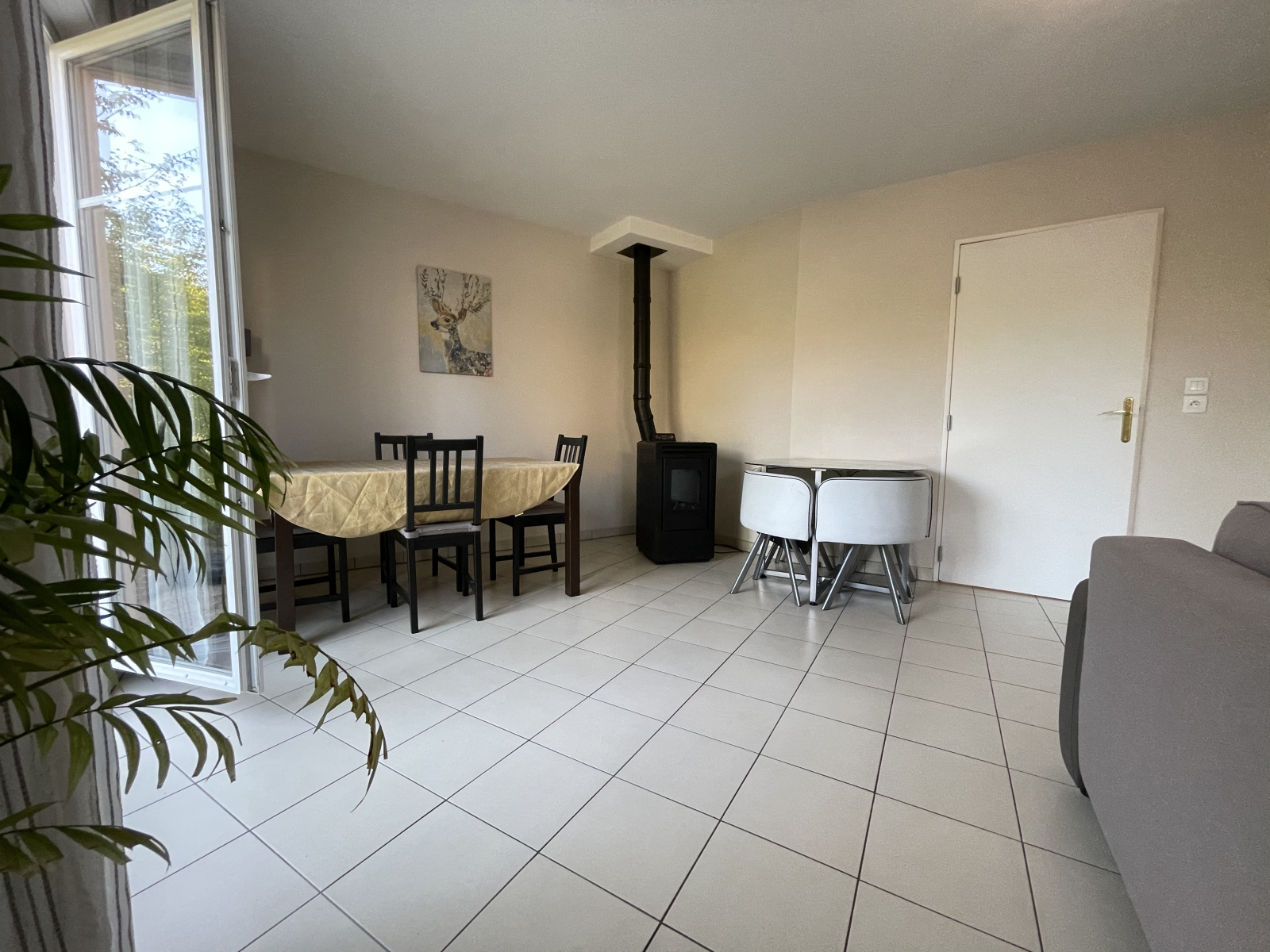 ELLE SE COMPOSE, AU REZ-DE-CHAUSSÉE : D'UNE ENTRÉE AVEC PLACARD, D'UNE CUISINE ÉQUIPÉE, D'UNE SALLE D'EAU AVEC WC, D'UN ESPACE BUANDERIE, ET D'UN SÉJOUR AVEC POÊLE À GRANULÉS ET ACCÈS TERRASSE.