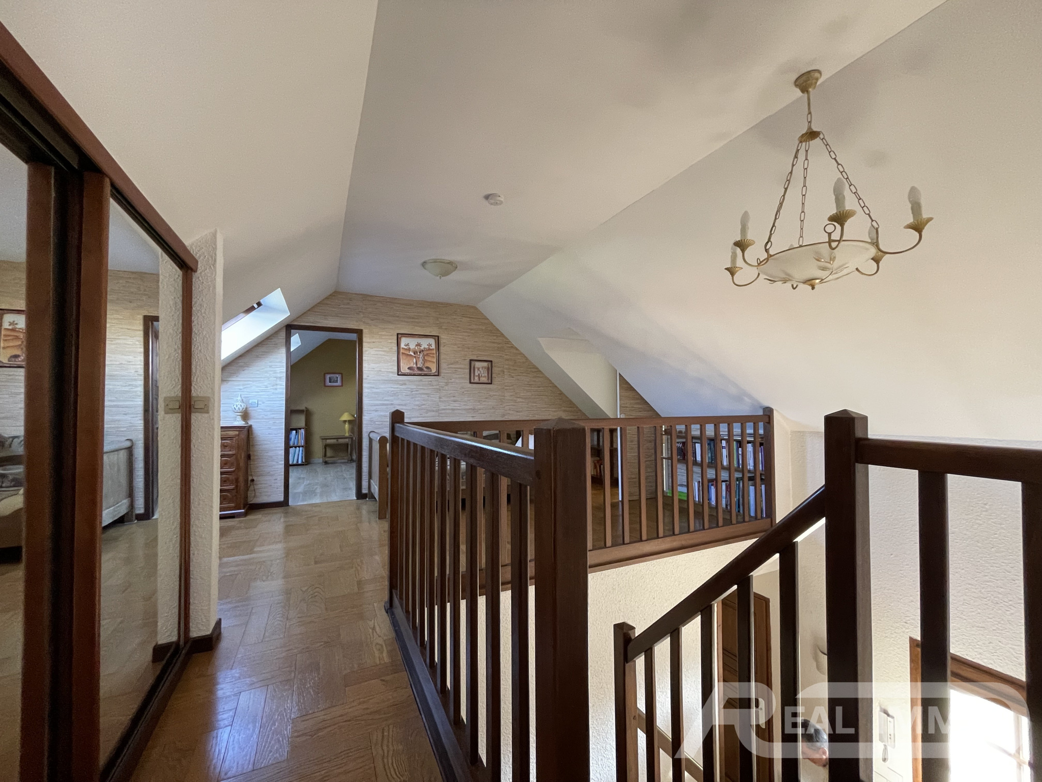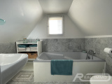 À l’étage, un palier avec espace bureau dessert deux chambres supplémentaires et une seconde salle de bains avec WC.