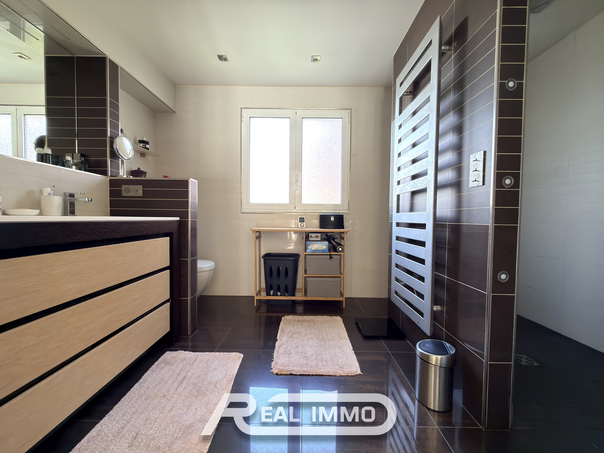 À l’étage, la maison dévoile un palie avec un espace bureau desservant une belle suite parentale avec salle d’eau et WC, trois chambres supplémentaires et une salle d’eau avec WC. L’ensemble a été conçu dans une logique de confort optimal et de prestations premium, avec un système de climatisation gainable à l’étage, particulièrement discret et qualitatif, via une pompe à chaleur air/air installée en 2023 au rez-de-chaussée et en 2025 à l’étage. La maison bénéficie ainsi d’une excellente qualité énergétique et d’un niveau de confort remarquable en toute saison.